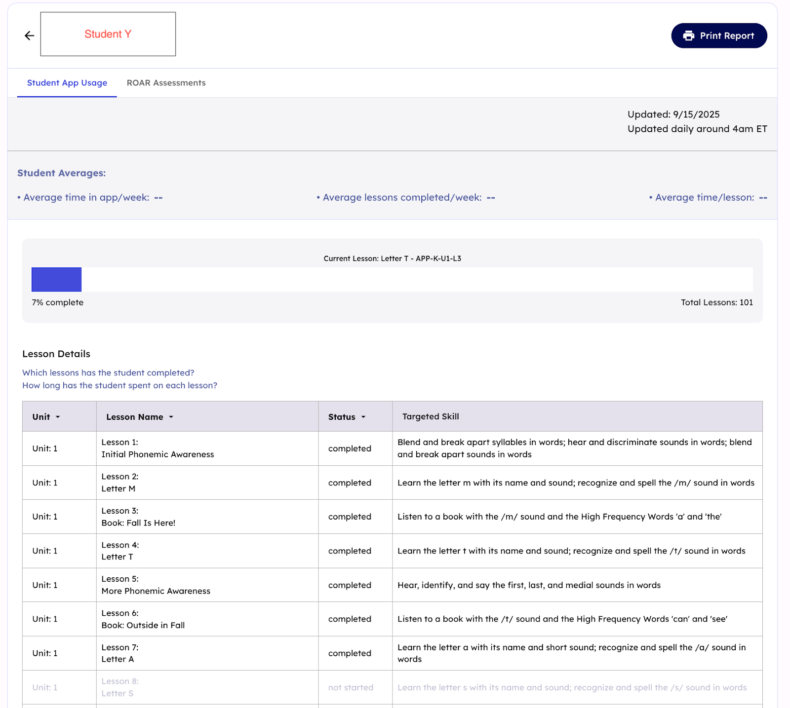 - Percentage of the grade level curricula completed and the student’s current lesson