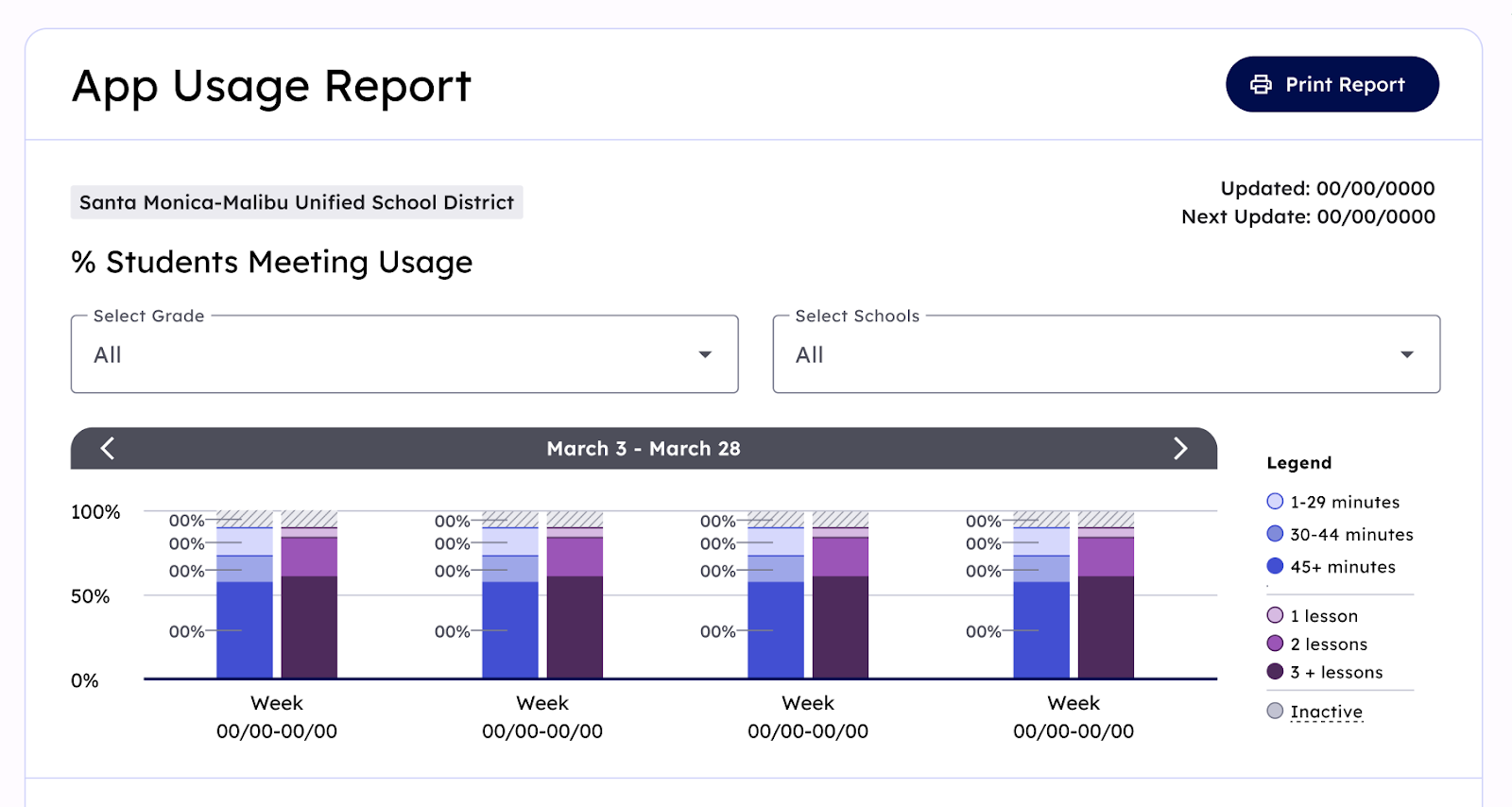 - Average active minutes/week and Average lessons completed/week will read “--” and will not be reported out at this time
