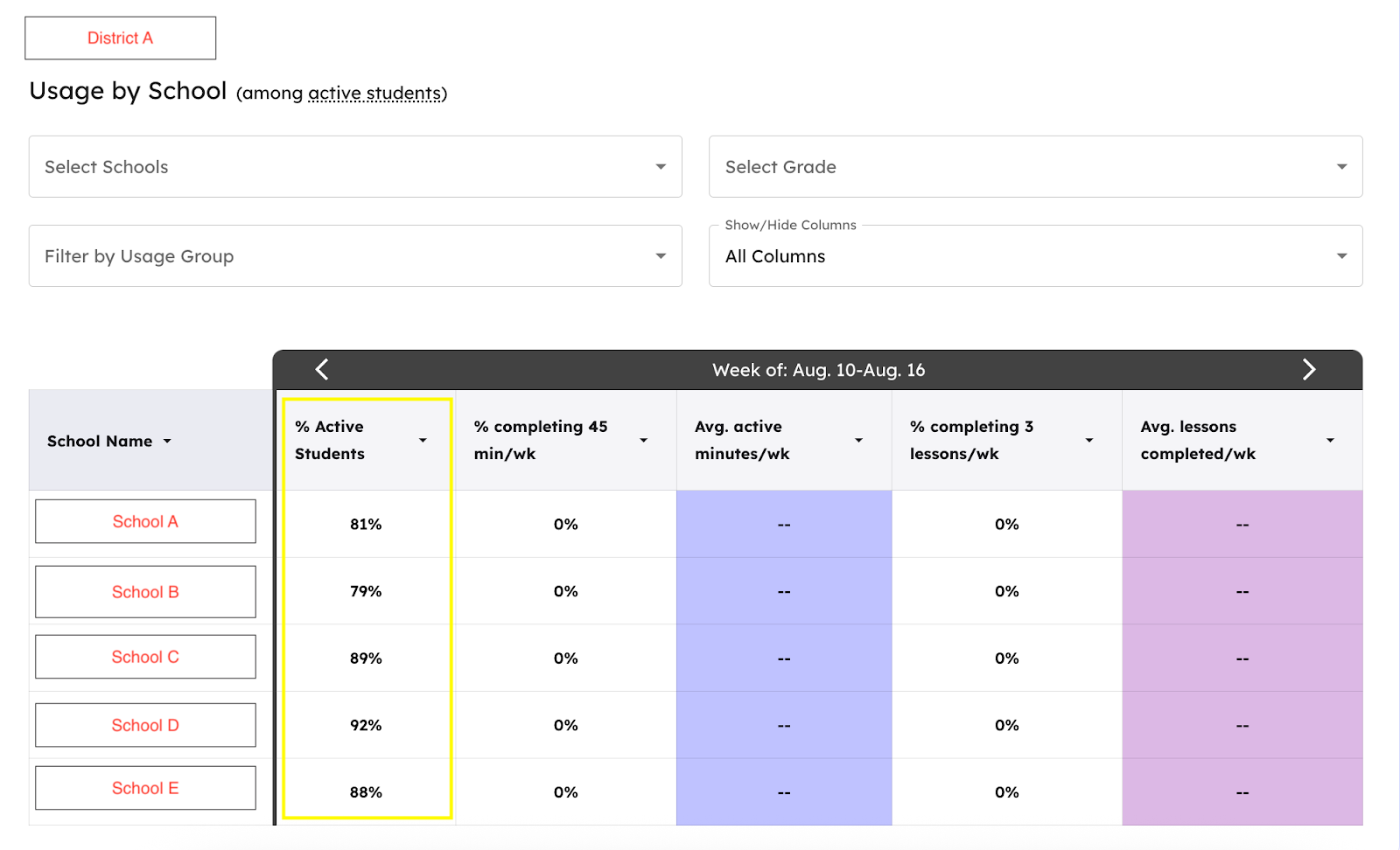 - Average active minutes/week and Average lessons completed/week columns will read “--” and will not be reported at this time