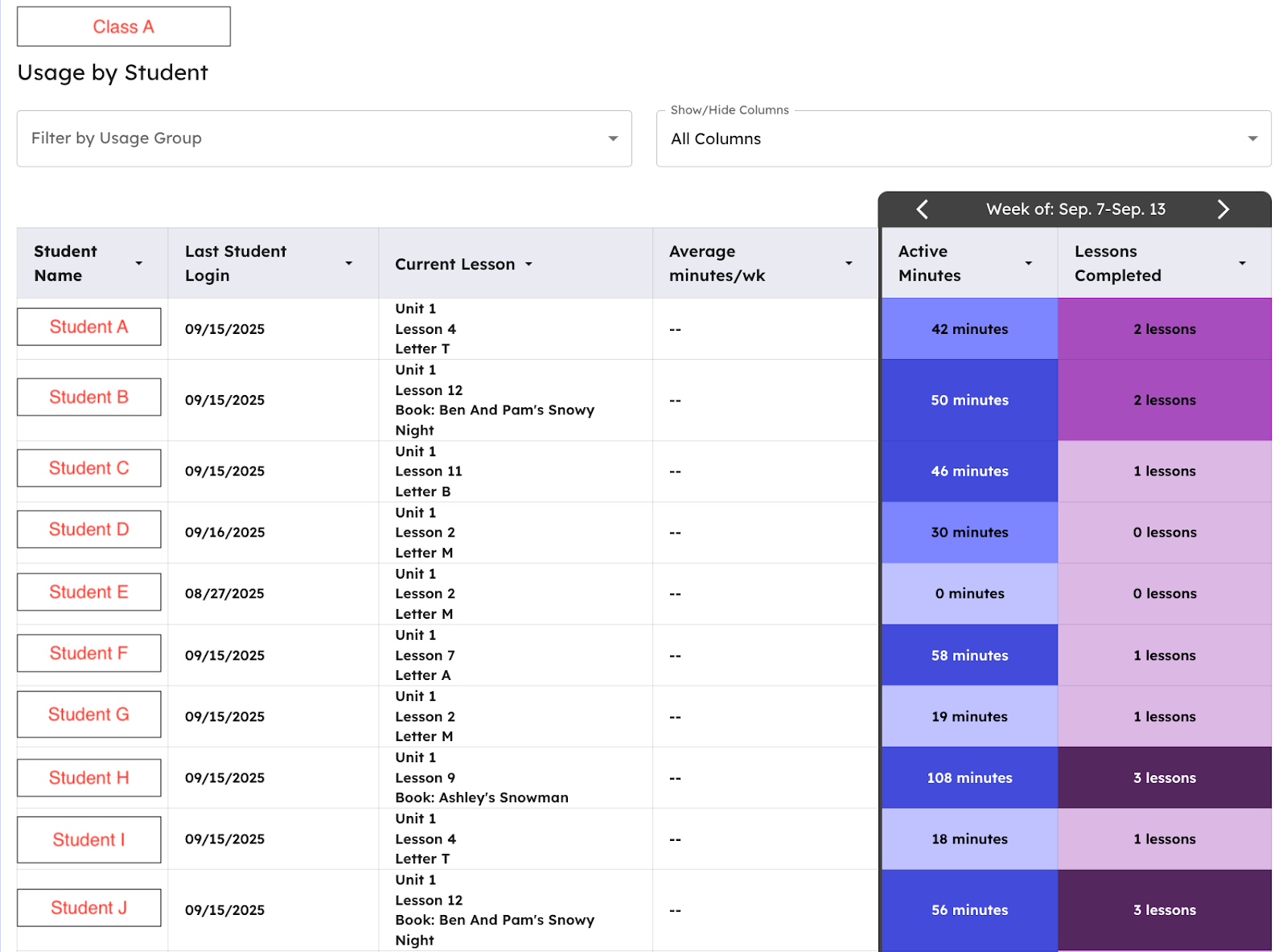 - Click into any Classroom Name and view the Class Usage Report with individual student usage data weekly