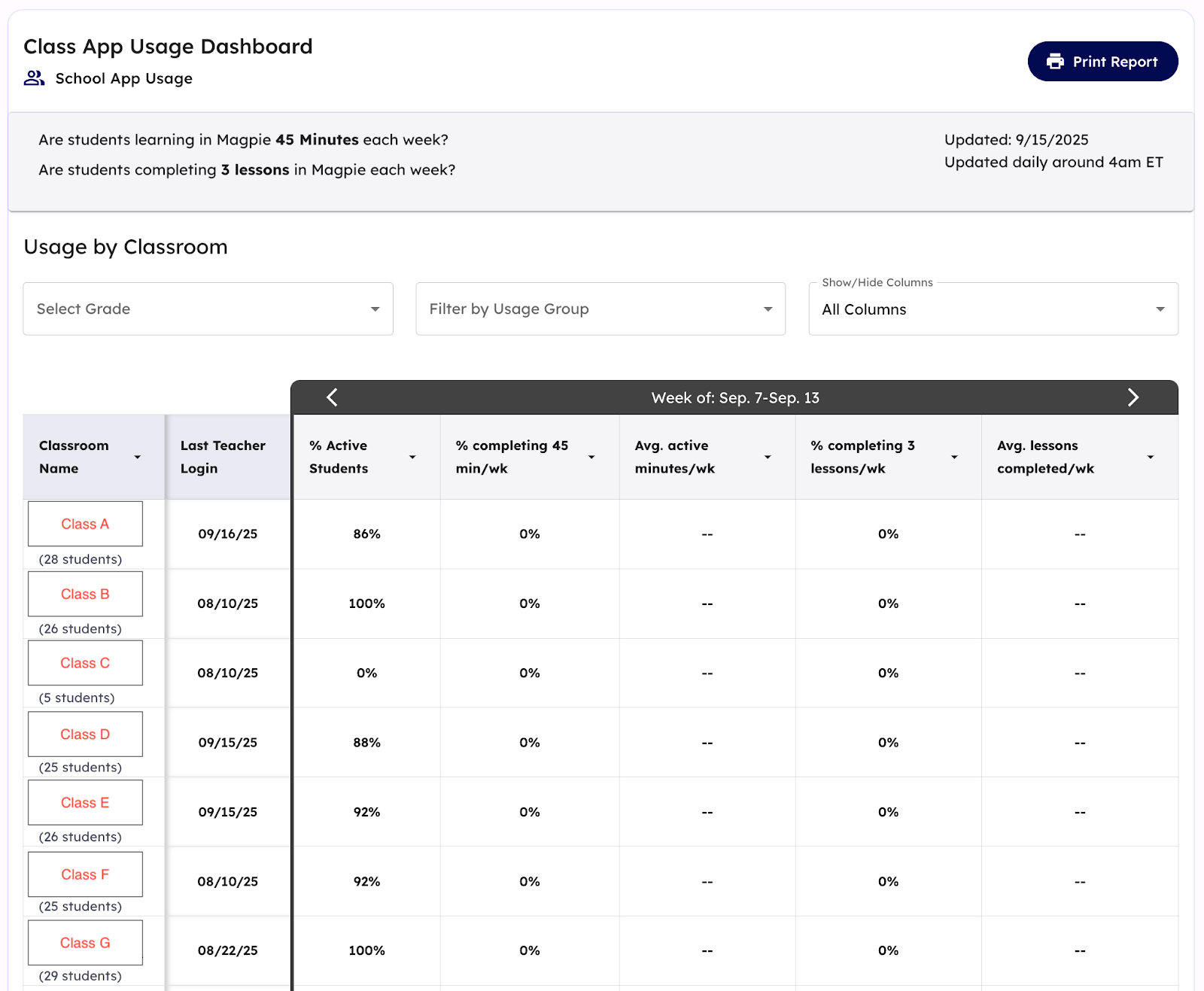 - Percentage of students in the classroom who completed at 3+ lessons in Magpie that week will read “0%” and will be updated with accurate data in the coming weeks