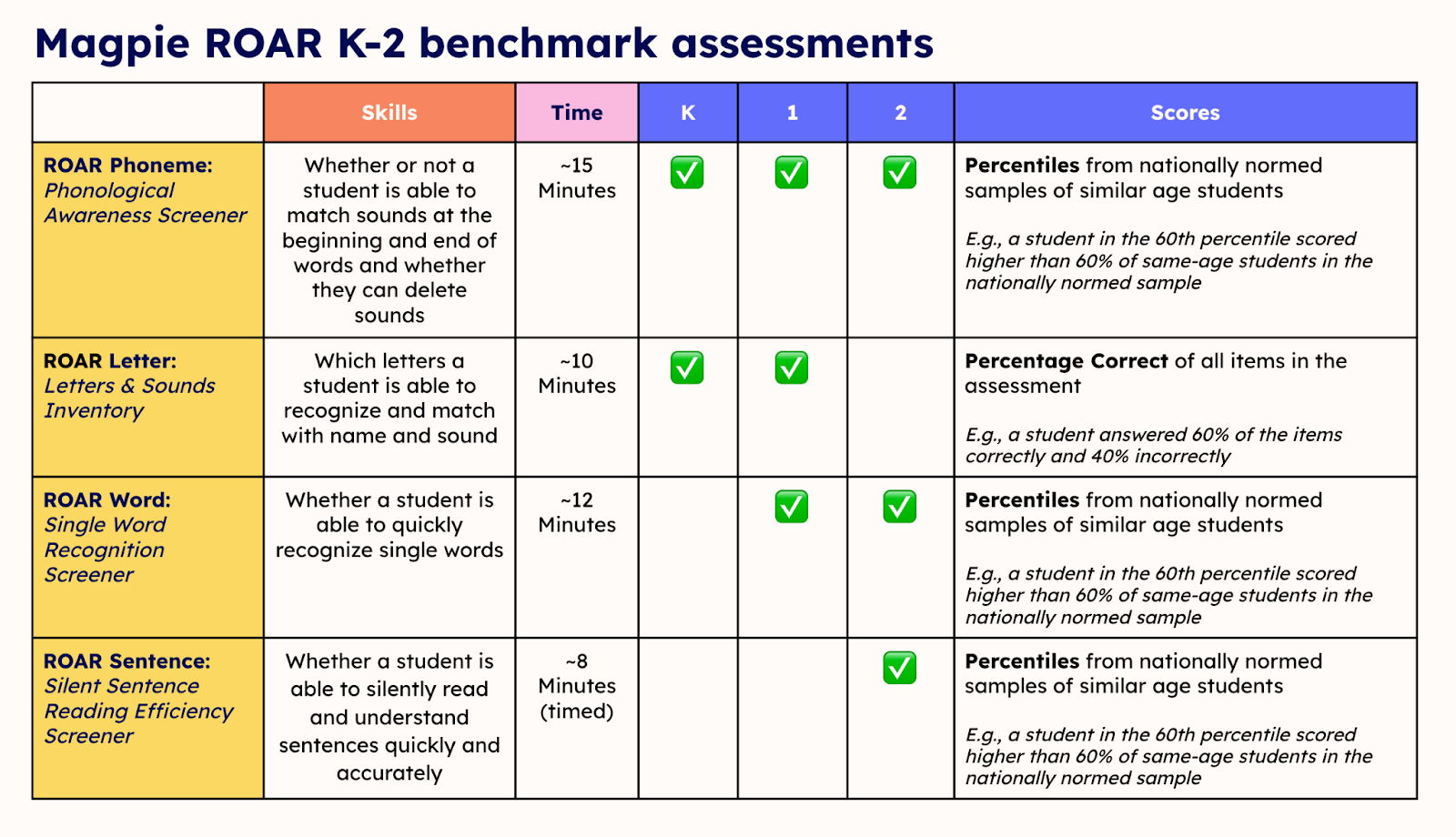 K-2 Magpie students complete ROAR® assessments (“ROAR® Days”) in Magpie 3 times during the year: