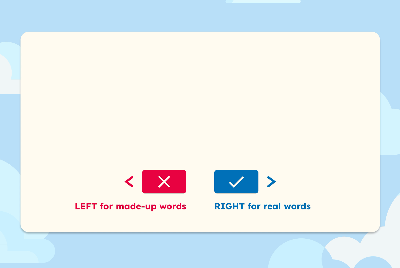 Press START to begin ROAR Word assessment If using a keyboard: “Press any key to continue.” Student uses Left and Right arrow keys to indicate made-up (Left) or real (Right) words Progress bar fills up as student completes assessment Student finishes assessment and progress is saved STOP when student sees Welcome to Magpie start screen. Raise hand so teacher can give another activity to work on while other students finish ROAR. Show students to click Sign Out button to sign out of Magpie. If using shared devices, sign out of ClassLink as well. After finishing ROAR Days, students begin Magpie Days playing learning games independently for 45-60 minutes each week on a regular Magpie schedule. |