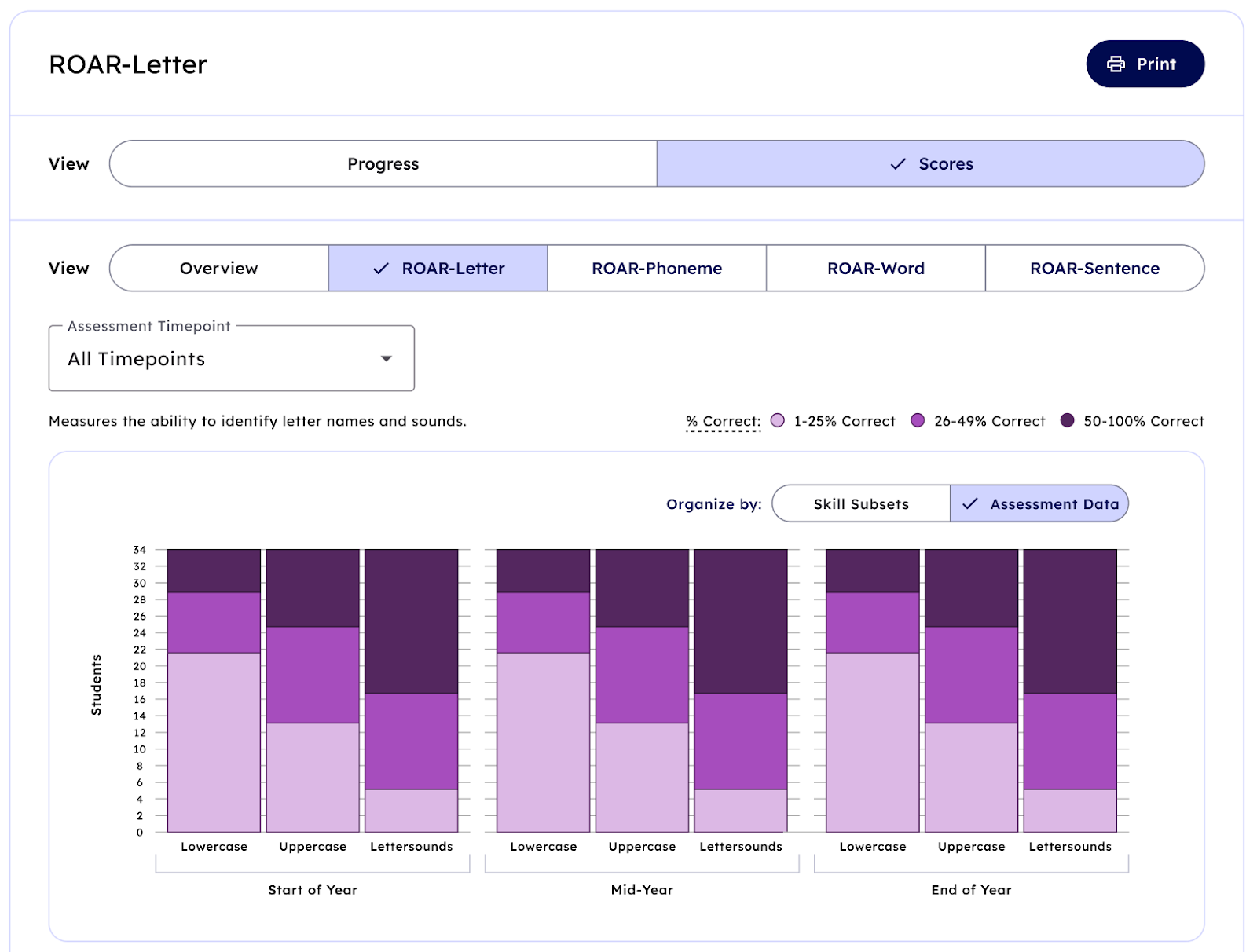 - This report shows the percentage of students in each of the three performance categories for each of the three subskills assessed in ROAR®-Letter:
