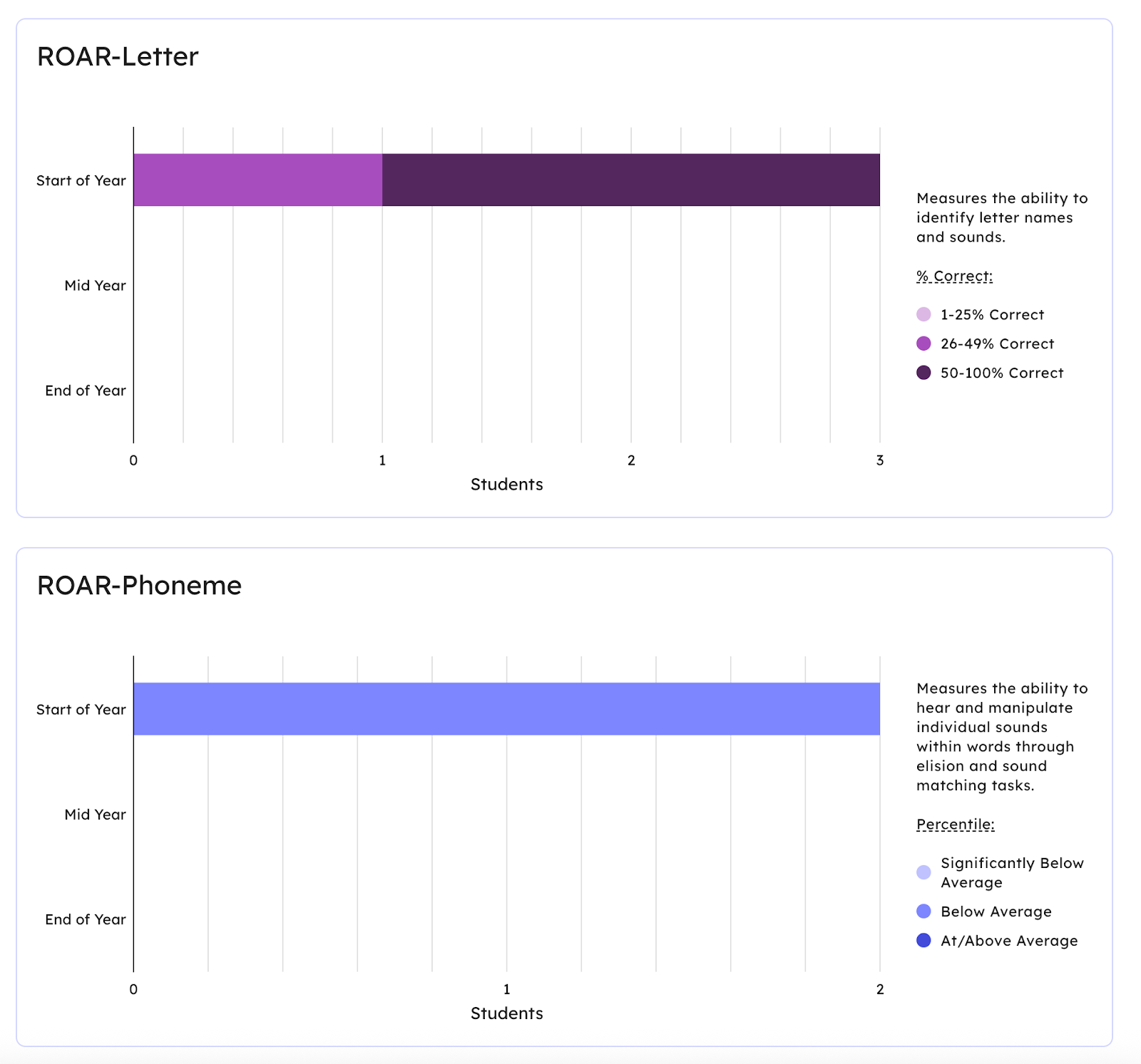 ROAR®-Letter Summary: an inventory assessment of all 26 letter names (uppercase and lowercase) and the most common sounds. We report ROAR®-Letter scores as the percentage of items students score correctly across uppercase letter names, lowercase letter names, and sounds in a composite score, as well as scores for each of the three subskills. We do not report percentiles which compare students’ scores to other students’ scores.