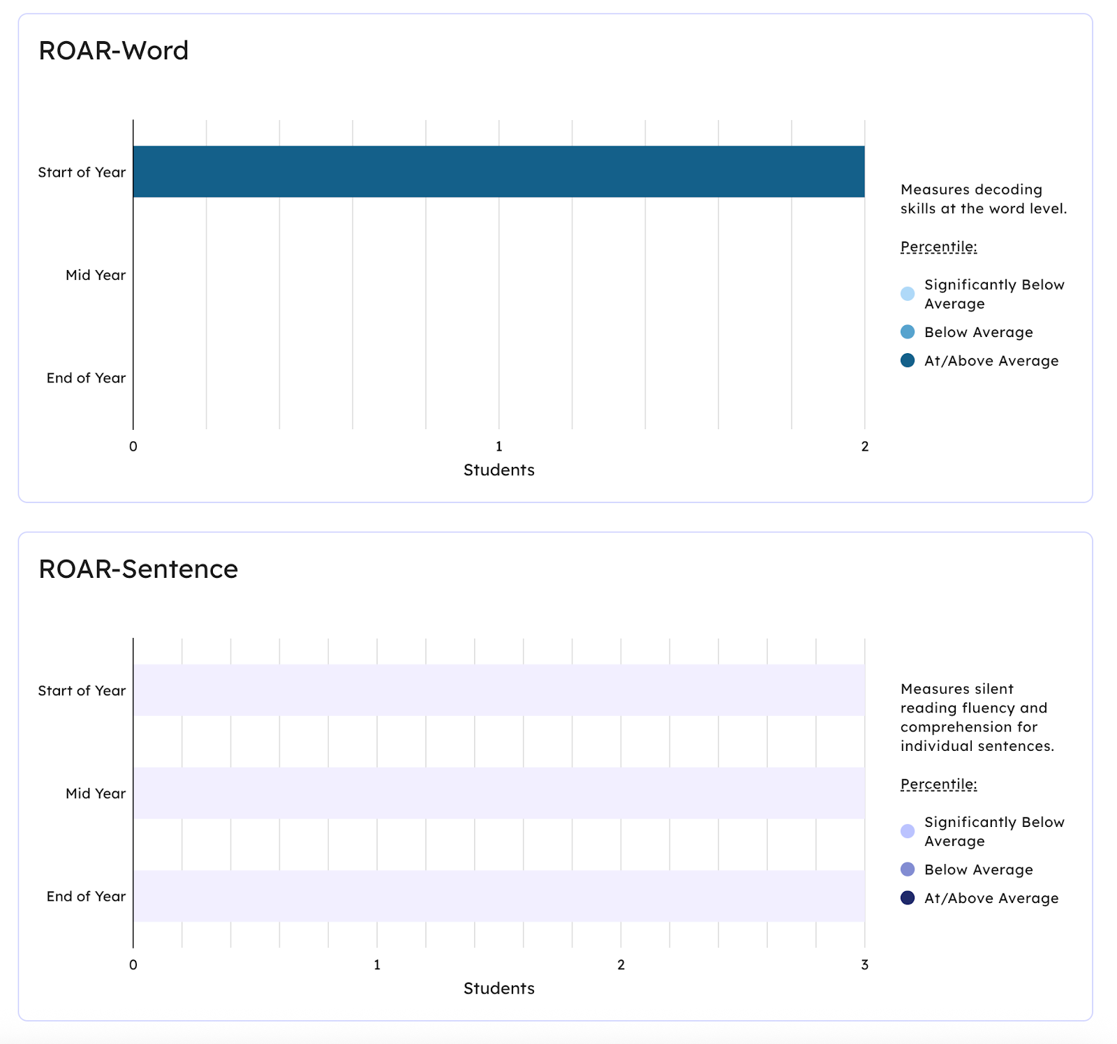 ROAR®-Sentence Summary: a screener assessment of students’ silent sentence reading efficiency. Students are asked to silently read sentences and accurately determine if they are true or false. ROAR-Sentence scores are reported as percentiles compared to a nationally normed sample and tell you how your students’ scores compare to other similar-age students’ scores.