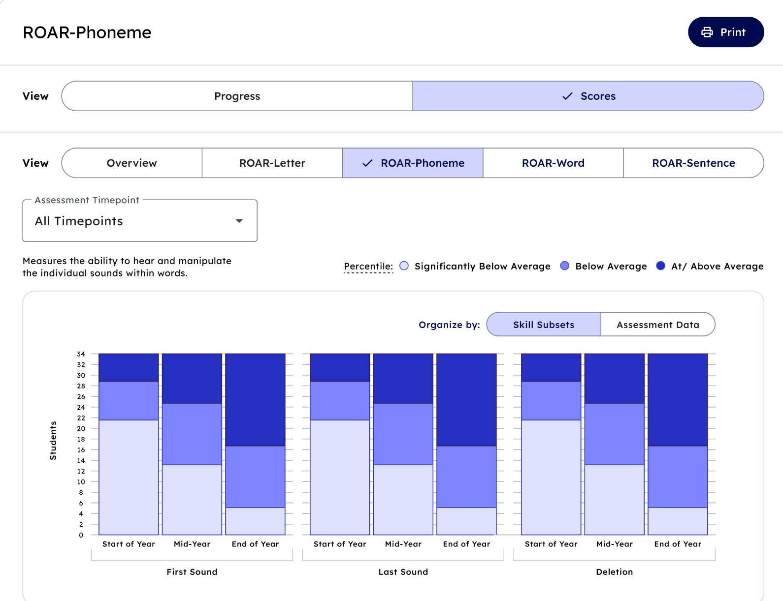 ROAR®-Phoneme Summary: a screener assessment of students’ mastery of phonological awareness skills including students’ ability to manipulate the individual sounds in words through elision (the process of omitting sounds or parts of words) and sound matching tasks (first sound matching and last sound matching). ROAR-Phoneme scores are reported as percentiles compared to a nationally normed sample and tell you how your students’ scores compare to other similar-age students’ scores.