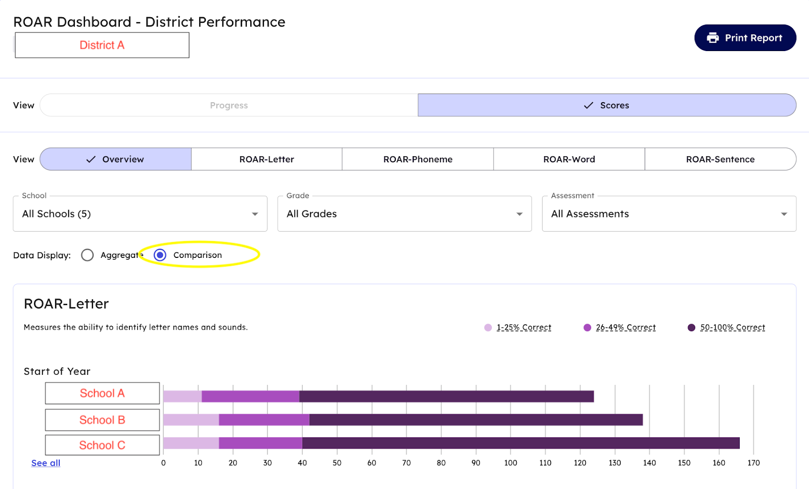 - Use the filter to select one or multiple schools and grades to see aggregate ROAR data for each subtest. E.g., if all schools and grades are selected, the data displayed will be aggregated across all schools and grades; if select schools and grades are selected, the data will be displayed for the selected school(s) and grade(s) only.