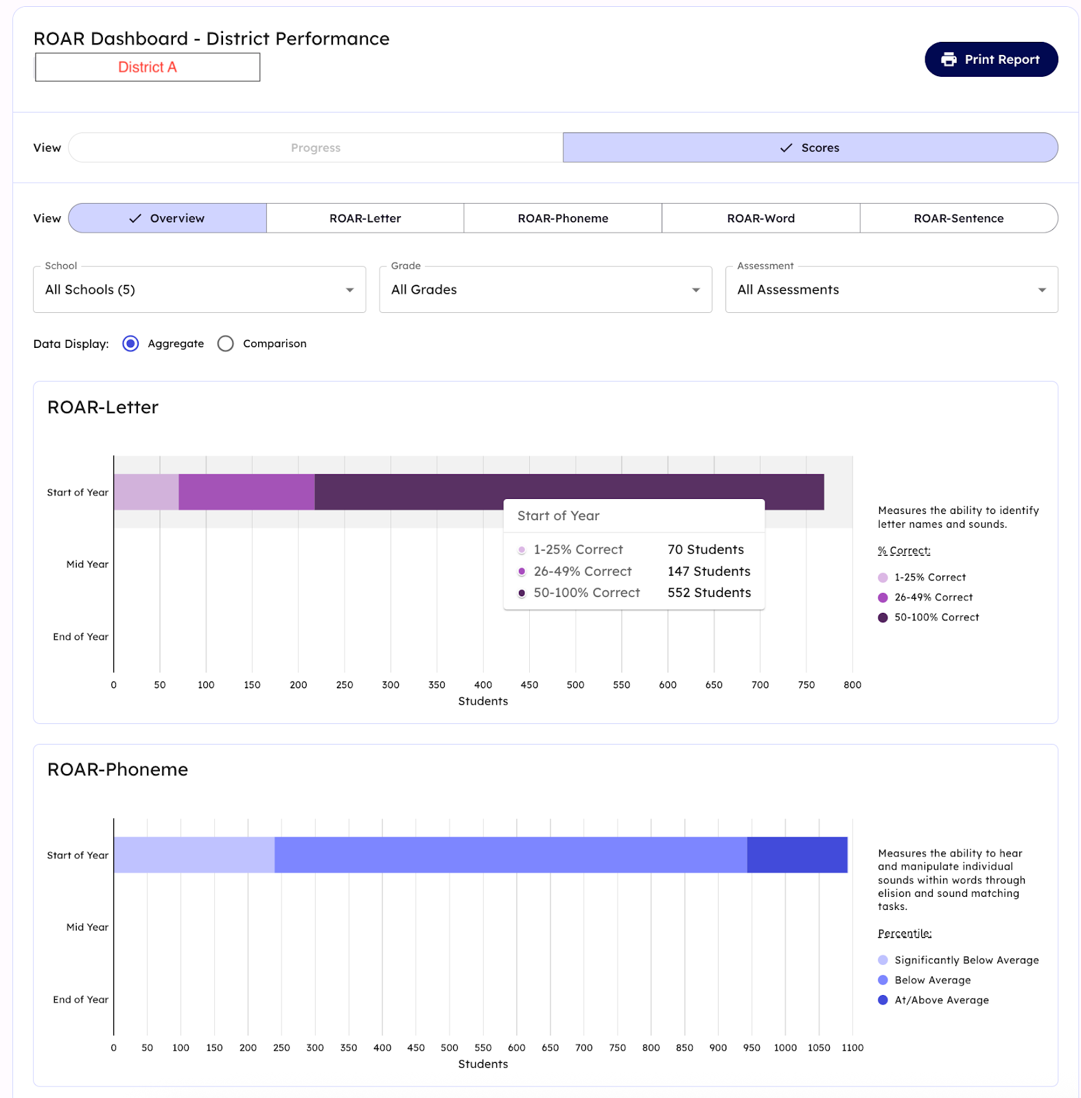 Step 3: Scroll down to see a School or District Summary of your students’ ROAR Scores for all administrations to date.