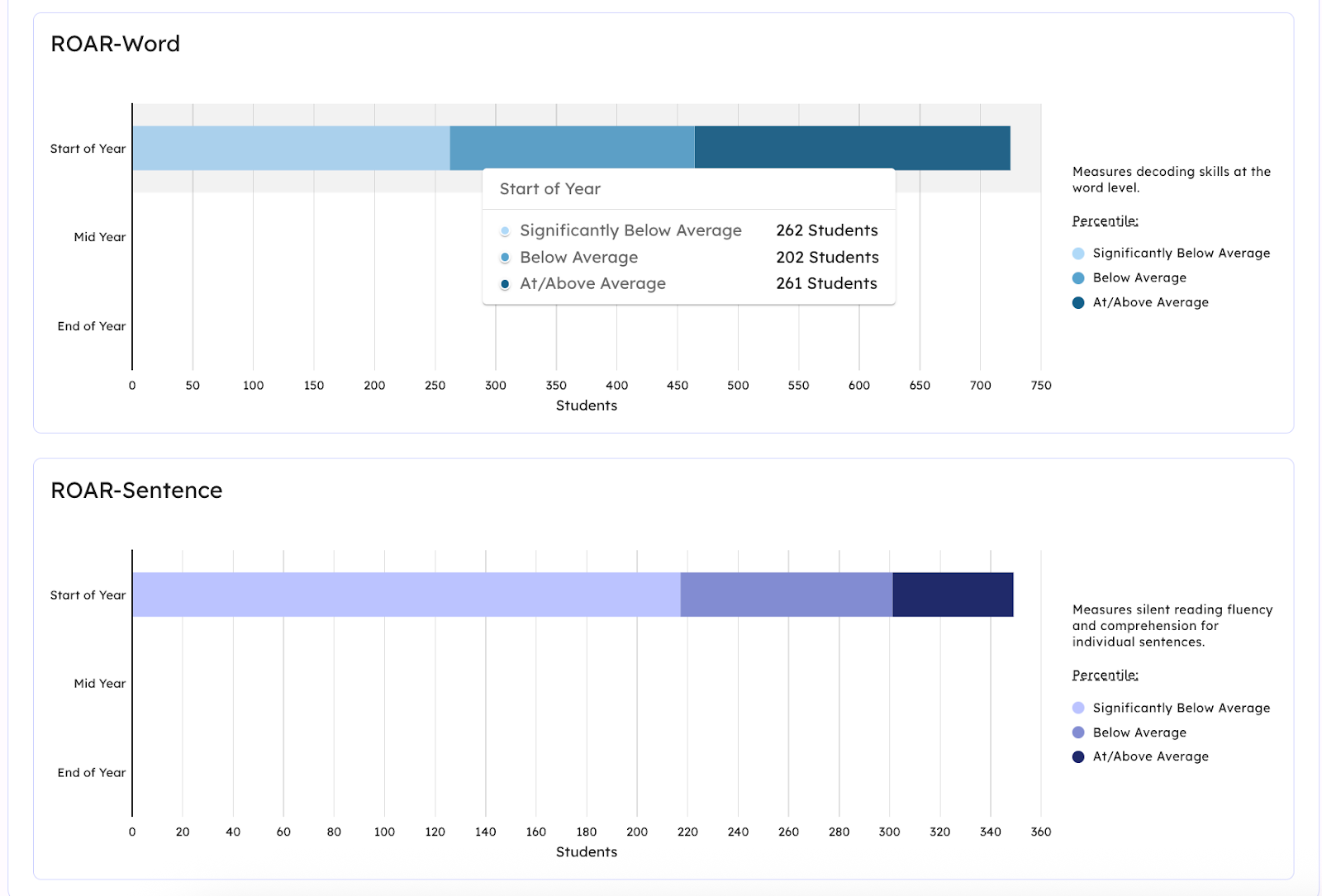 ROAR-Sentence Summary: a screener assessment of students’ silent sentence reading efficiency. Students are asked to silently read sentences and accurately determine if they are true or false. ROAR-Sentence scores are reported as percentiles compared to a nationally normed sample and tell you how your students’ scores compare to other similar-age students’ scores.
