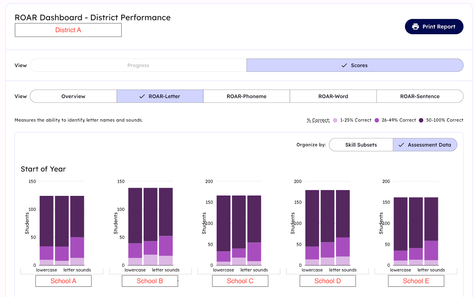 - This report shows the percentage of students in each of the three performance categories for each of the three subskills assessed in ROAR-Letter: