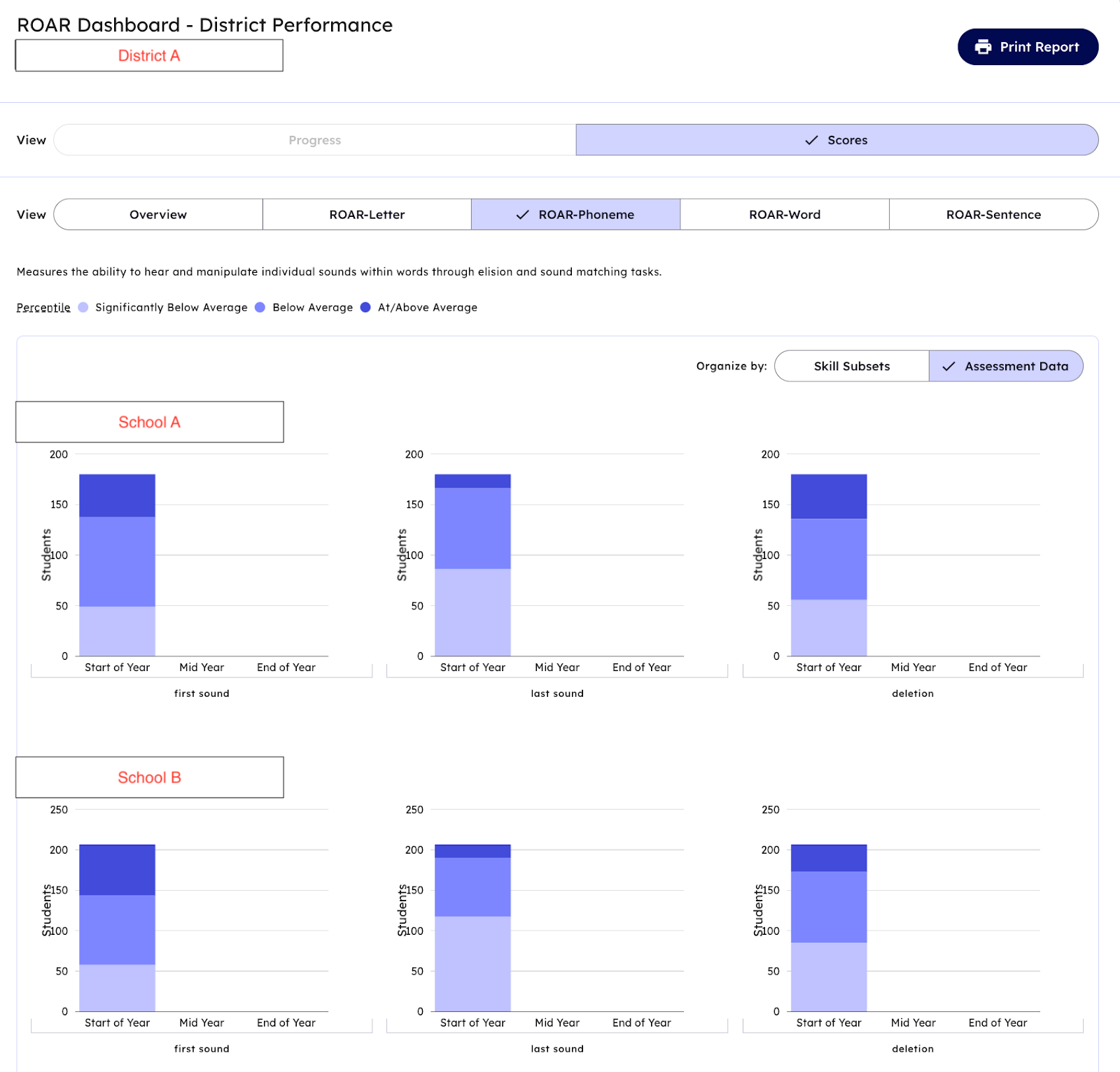 - This report shows the percentage of students in each of the three performance categories for each of the three subskills assessed in ROAR-Phoneme (at each of three time points across the year):